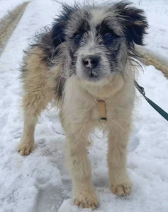 Der kleine Aron wurde Anfang Januar in den Bergen in Arieșeni in Rumänien gefunden. Er war auf der Suche nach Futter, als er an einem Ferienhaus vorbeikam. Er war nur noch Haut und Knochen, sehr hungrig und hat alles blitzschnell aufgefressen, was er kriegen konnte. Er blieb in der Nähe, daher hat Karcsi ihn bei der Rückfahrt mit nach Sisterea genommen.