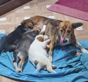 Tierfreund*innen hatten Fiona mit ihren drei Welpen in einem Gebüsch an einer Tankstelle in der Nähe von Lwiw/Ukraine entdeckt. Sie haben die Tiere dort zunächst notdürftig versorgt und eine Hütte aufgestellt. Es ist nicht leicht, in einem Kriegsgebiet eine Pflegestelle zu finden. Nachdem das aber mit viel Glück gelungen war, haben sie alle vier Hunde abgeholt. Sie befinden sich jetzt in der Obhut von liebevollen Menschen. Hier können Fiona und die drei kleinen Mädchen sich erholen. Sie werden auch tierärztlich betreut. Fiona hat einen verheilten Bruch in einem Hinterbein, der sie nicht wesentlich behindert, sowie eine akute Gesäugeentzündung, die inzwischen behandelt wurde. Im Februar 2026 werden alle vier ausreisefertig sein.